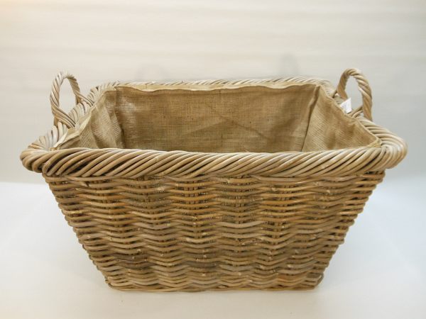 Praktischer und schöner Kaminholzkorb, rechteckig-konisch, aus grauem Rattan.